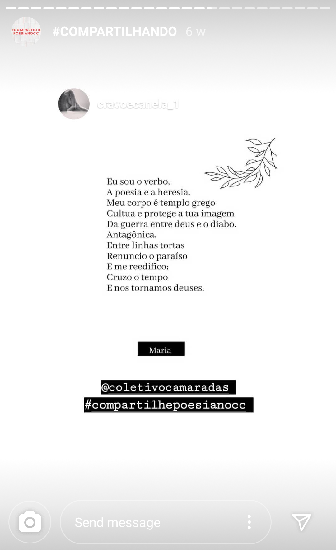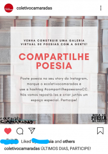 Olha que legal: durante o último mês o Coletivo Camaradas realizou, no seu Instagram @coletivocamaradas, uma iniciativa para compartilhar poesias.