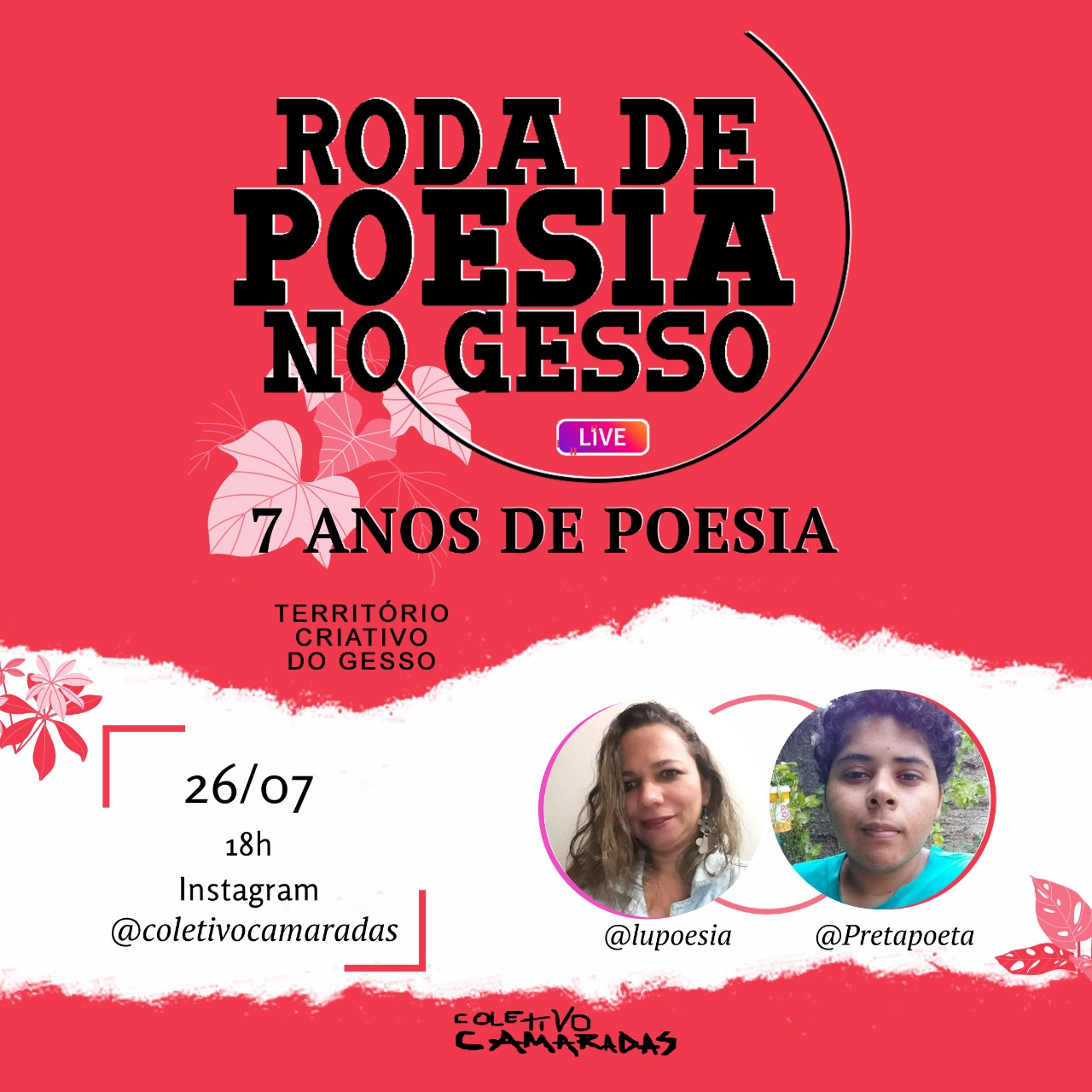 Conforme eu já havia comentado aqui na coluna anteriormente, a Roda de Poesia no Gesso, do Coletivo Camaradas, completa este mês 7(!) anos de existência. O encontro virtual deste Domingo, sempre realizado através do Instagram @ColetivoCamaradas, será especial em decorrência da data importante.